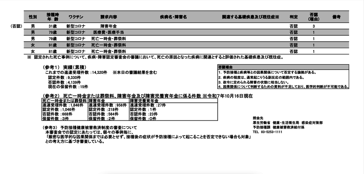 (参考2) 死亡一時金または葬祭料、障害年金及び障害児養育年金に係る件数 ※令和7年10月16日現在 死亡一時金または葬祭料 進達受理件数 :1,846件 認定件数 :1,046件 mhlw.go.jp/content/109000… #ワクチン副反応 #コロナワクチン #コロナ pic.x.com/lZhRc8nfOF