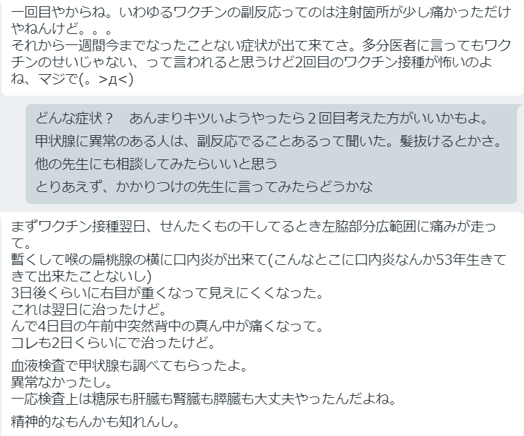 「左脇部分広範囲に痛み」「喉の扁桃腺の横に口内炎」「右目が重くなって見えにくくなった」「突然背中の真ん中が痛くなって」 結構な症状でてるやん。 口内炎とか目が見えなくなるとか、結構聞くよな。 マジ2回目考えたほうがいいって、と返信したんだけどさ。 #ワクチン副反応 pic.x.com/dpRNtvFl4j