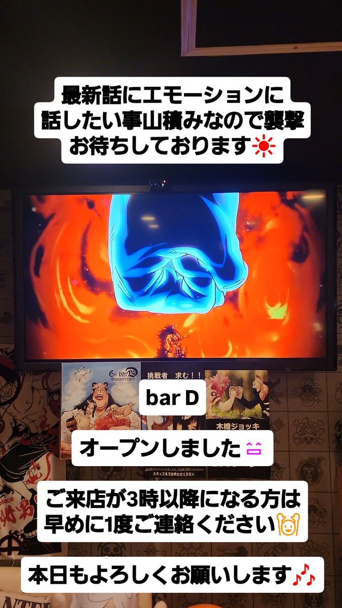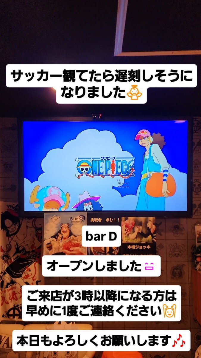 bar D オープンしました😄 ご来店が3時以降になる方は 早めに1度ご連絡ください🙌 本日もよろしくお願いします🎶 #ワンピース #ワンピースバー #アニメ #アニメバー #ワンピースカードゲーム #ワンピカード #ワンピース好きさんと繋がりたい #バウンティラッシュ #インボイス対応 pic.x.com/2qG9yk8oDR x.com/sawaD_0830/sta…