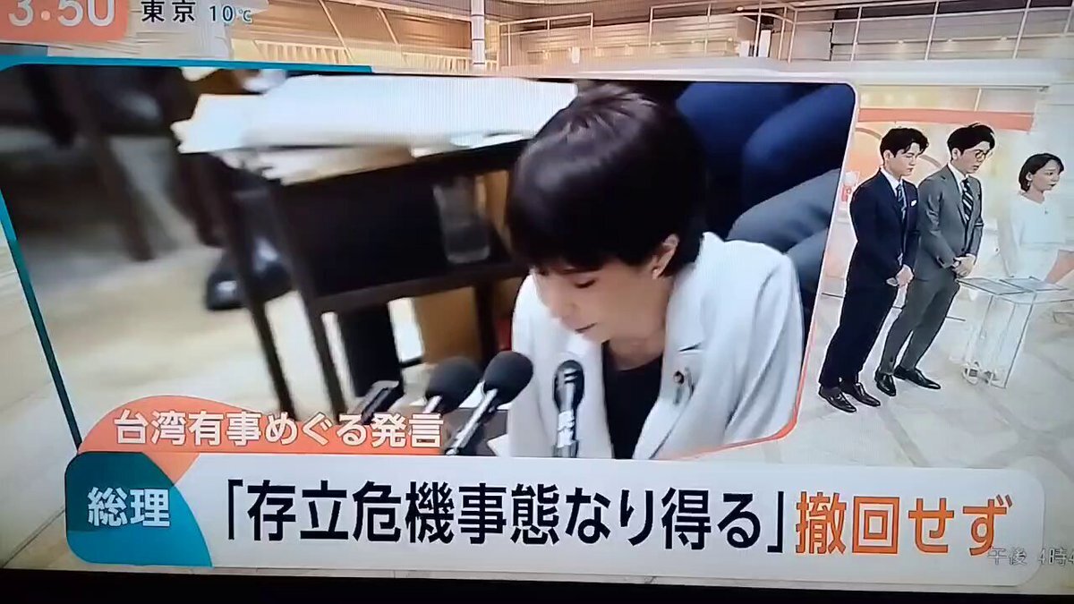 高市早苗は、台湾有事が「存立危機事態になりうる」と暴言。 発言の撤回を求める野党に「従来の政府の立場を変えるものではない」と虚言の高市早苗。 歴代政権は台湾有事が「存立危機事態」か明示していない。(画像 Nスタ)