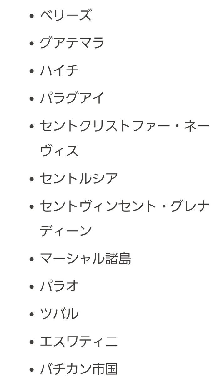 返信先:@4vgzi0FVbBd7bwK他4人アメリカ、日本を含めた主要国全てが 「一つの中国プロパガンダ」支持してます。 現在台湾を国家承認してる国一覧 ☟☟☟☟☟☟