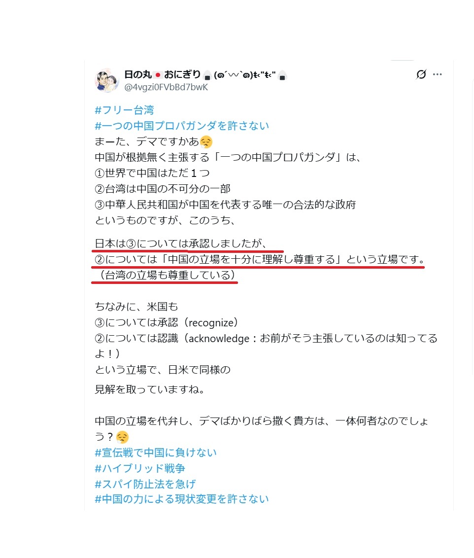 返信先:@kazuki_csjp他2人#一つの中国プロパガンダを許さない #台湾有事は日本存立危機事態 しっかり読みました!😃 日本は「中国の立場を十分に理解し尊重する」という立場ですよね^^ (台湾の立場も尊重している) ちなみに、米国も同様の立場のようです。 ところで、 「一つの中国プロパガンダ」 続 x.com/kazuki_csjp/st… pic.x.com/vmCH6u0O6w
