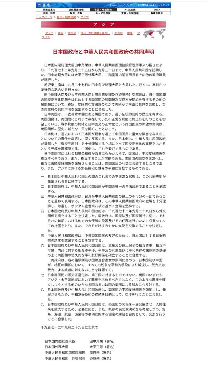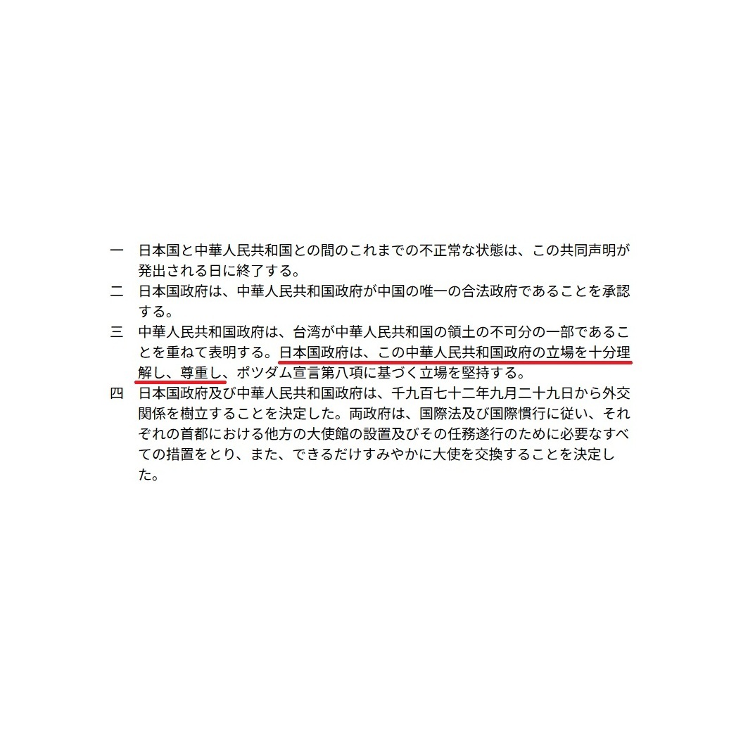 返信先:@bokukurakendayo#一つの中国プロパガンダを許さない デマです😮💨 一つの中国プロパガンダ ①世界で中国はただ1つ ②台湾は中国の不可分の一部 ③中華人民共和国が中国を代表する唯一の合法的な政府 のうち、 日本は③については承認しましたが、 ②については「中国の立場を十分に理解し 続 x.com/bokukurakenday…