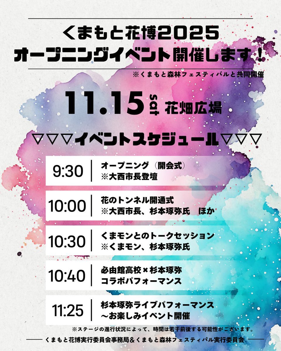 皆様大変申し訳ございません! くまもと花博OPイベントの杉本琢弥様ライブパフォーマンス時間を修正いたしました😭 周りのお友達にも共有いただけますと幸いです🙇‍♀️ 【11:55→11:25】 #くまもと花博 #熊本市 #森の都くまもと #熊本の彼氏 #一人一花運動 #杉本琢弥