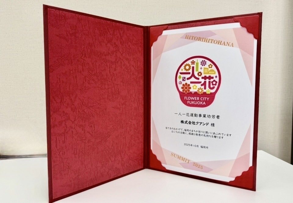 \ 花とともに、福岡をもっと明るく🌸/ この度クアンドは、福岡市「一人一花運動」における事業功労者として表彰されました💐 福岡のまちをもっと明るく、もっと華やかに✨ 今後も #一人一花運動 メディアパートナーとして福岡を彩る取り組みに力を入れてまいります💐 #一人一花 #福岡市 #地域連携 pic.x.com/UqCASOABBw