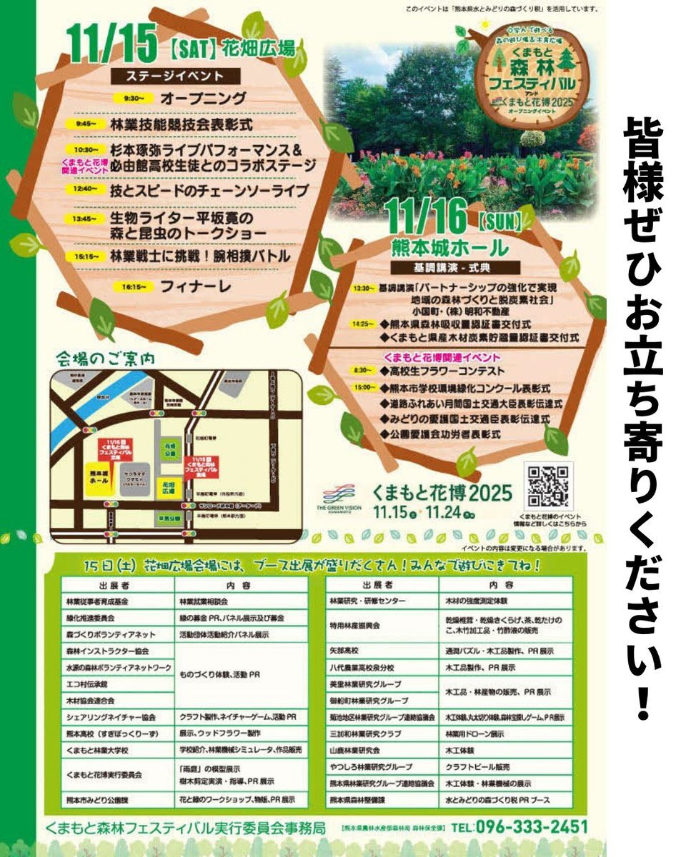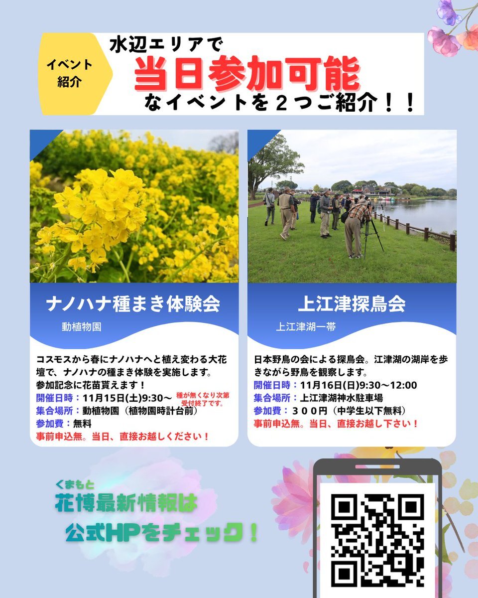 【くまもと花博2025まであと6日🌸】 11/15(土)〜24(月・振)は街なか・水辺・まち山の3会場で開催! 今日は、水辺エリアで当日参加できるイベントを2つ紹介します✨ 詳しくは花博公式HP(kumamoto-hanahaku.com)をチェック🔍 #くまもと花博2025 #熊本市 #森の都くまもと #一人一花運動 pic.x.com/hcDYwTIstM