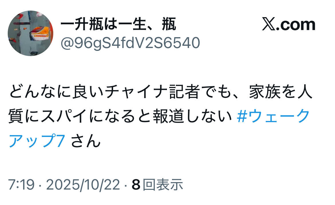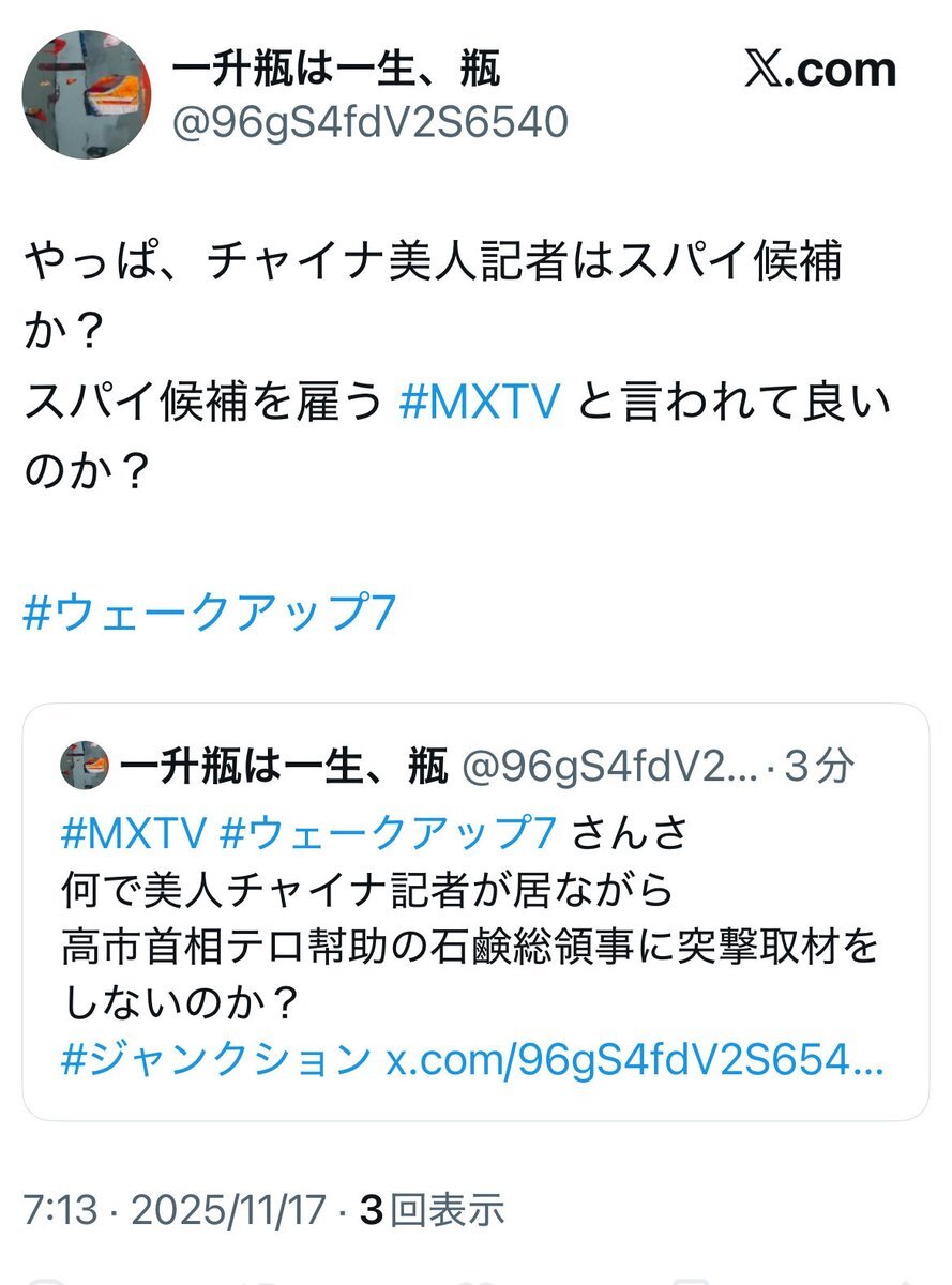 「中国人記者」だけで無く、気に入らない日本人にもスパイレッテル。 ホンモノのスパイには全く無力な右層。 @96gS4fdV2S6540 #一升瓶は一生瓶 #MXTV #ウェークアップ7 #ジャンクション pic.x.com/iuMrQ1JARq