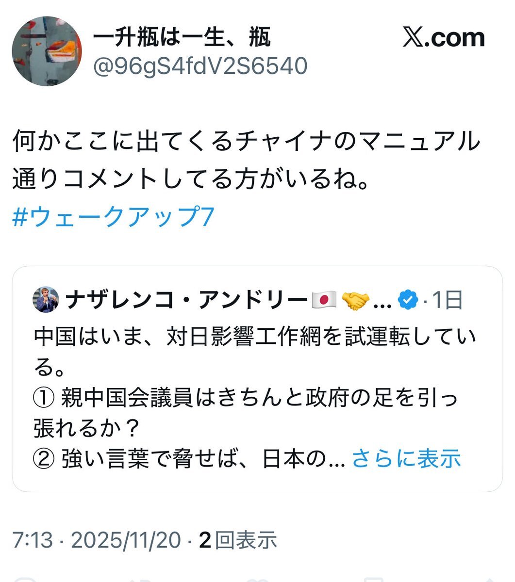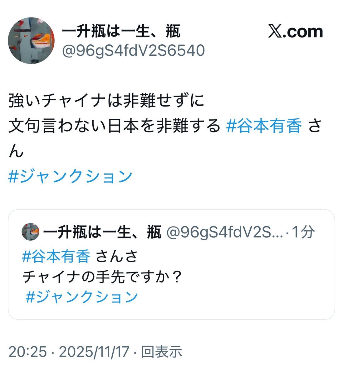 強いチャイナには乗り込まずに国内でイチャモン付けまくる @96gS4fdV2S6540 #一升瓶は一生瓶 #ジャンクション pic.x.com/LJr7i9p9Zs