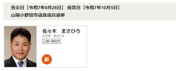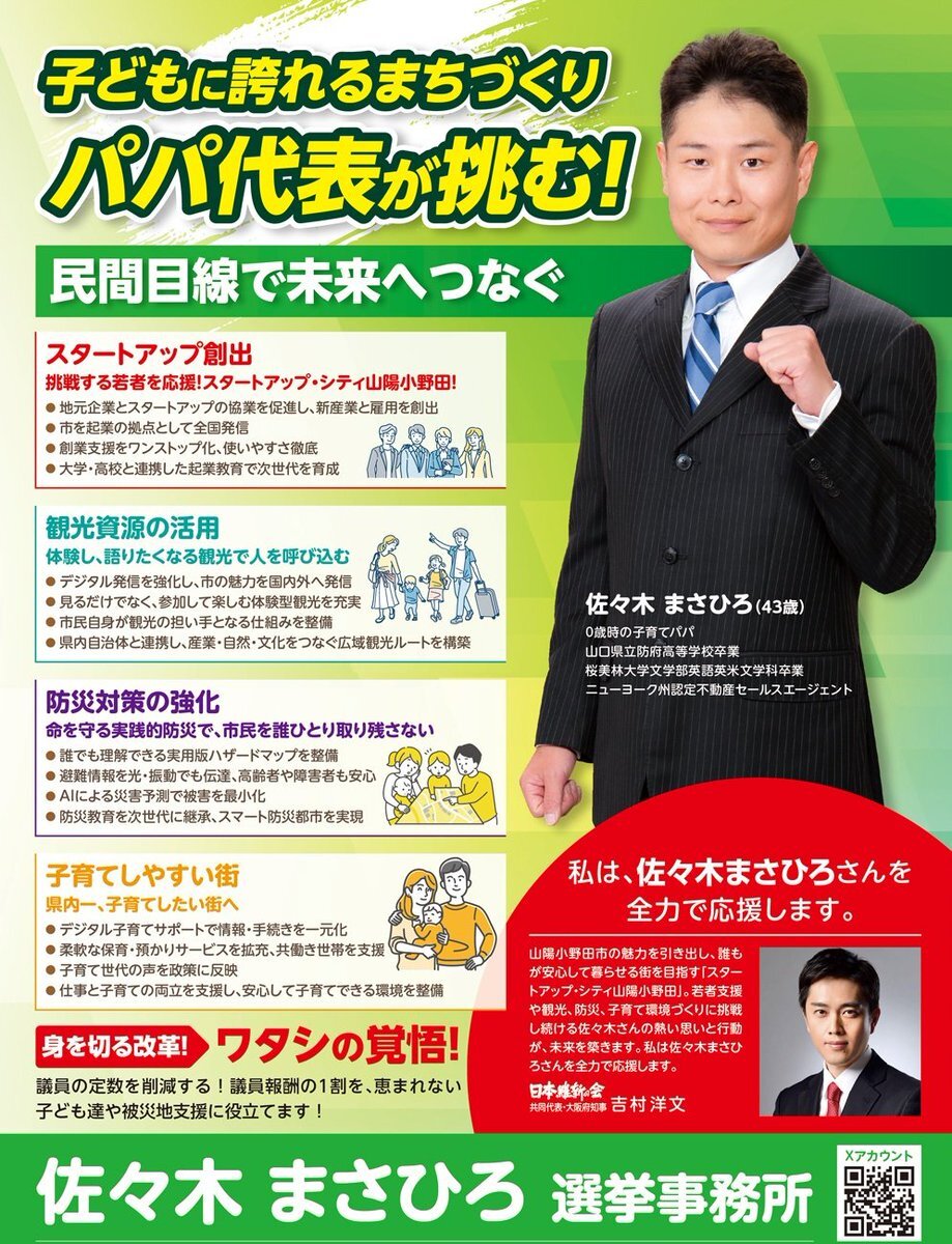 #山陽小野田市議会議員選挙 定数22 10月5日投開票 #日本維新の会公認候補 1名 #佐々木まさひろ 新人 @masa_sasaki