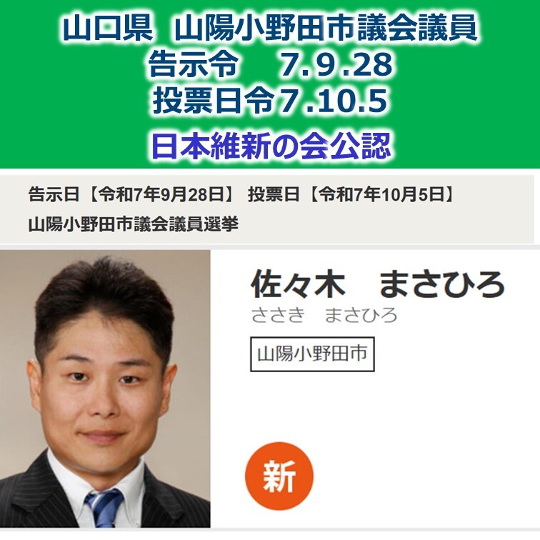 2025年10月5日投票日の山陽小野田市議会議員選挙「佐々木まさひろ」さんが、日本維新の会公認候補予定者として決定しました。 組織なく議員もいない山口県で維新の旗を共に掲げてくれる仲間です!! #日本維新の会 #山陽小野田市 #一周まわって維新 #山口3区 #佐々木まさひろ pic.x.com/ZB1fJ0jvKk