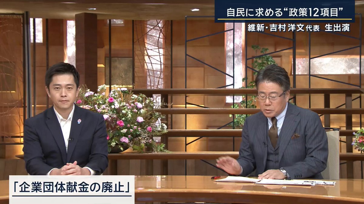 【維新・吉村洋文代表生出演②】『企業・団体献金の禁止』について | ▼すぐに禁止を求めず、自民党に猶予を与える? 日本維新の会 吉村洋文代表