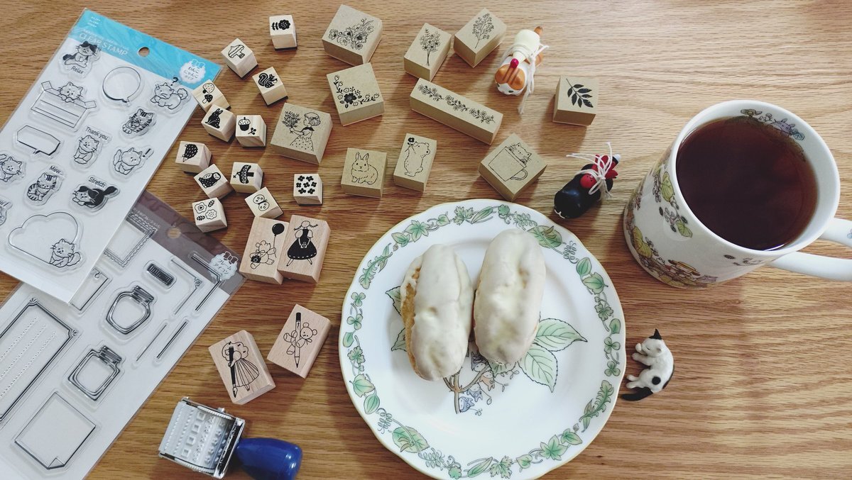 今日のお茶は、ルピシアさんの「月に咲く」です。 おやつは、モンテールさんの「リプトン ミルクティープチエクレア」です。 #茶好連 #一日一茶 お友達が、セリアやダイソーにかわいいスタンプが売っていることを教えてくれました。 すごいなあ。どれも素敵。 たくさん買ってしまいました。 pic.x.com/VoOkpk0Hrh