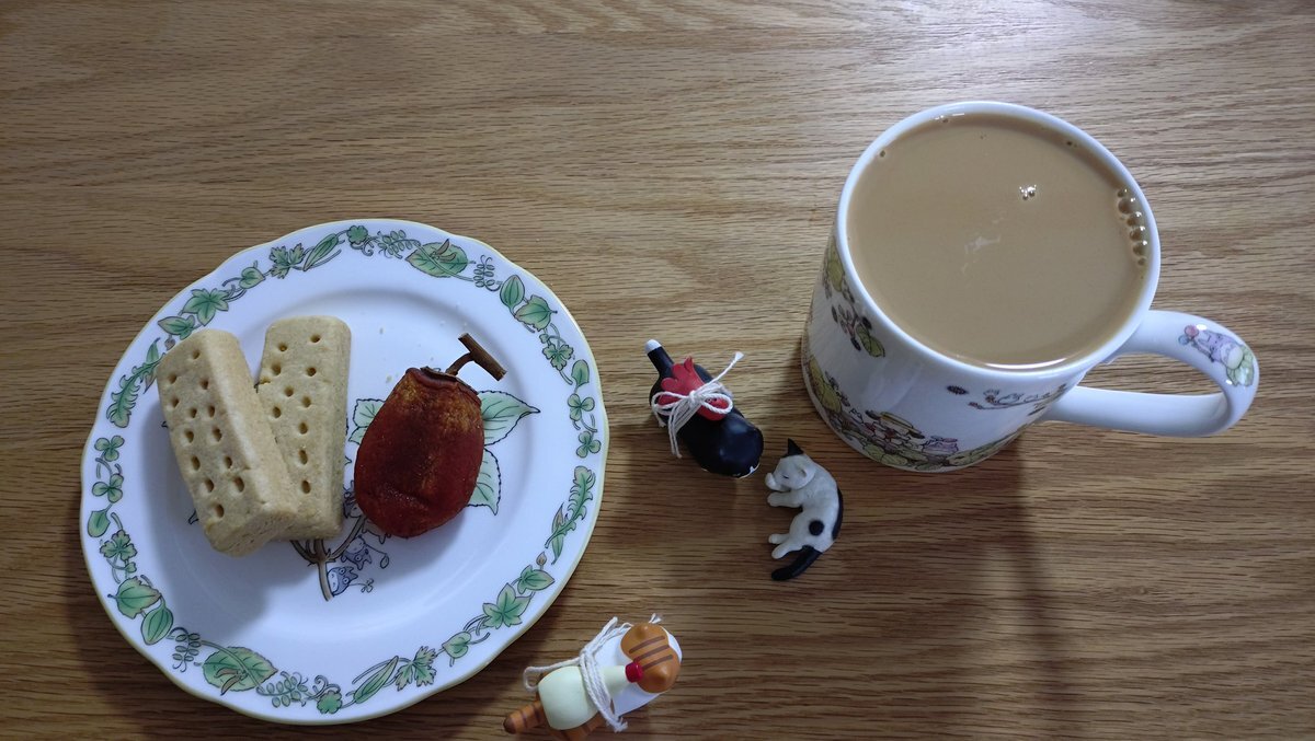今日のお茶は、青山ティーファクトリーさんの「RUHUNAニュービターナ茶園」です。 おやつは、「ショートブレッド」「郷愁の柿」です。 #茶好連 #一日一茶 いつも買っていたお店のショートブレッドが、どどん!と値上がりしました。円安のせいでしょうか。ショックだなあ。 pic.x.com/n7TEM8b4Gr