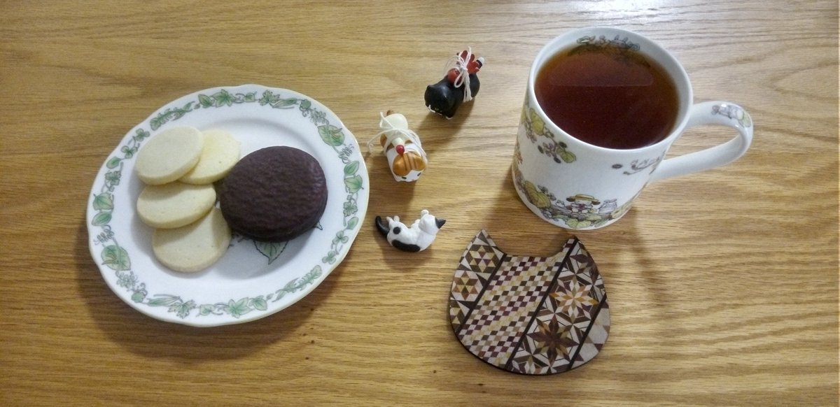 今日のお茶は、甲斐製茶園さんの「みなみさやか」です。 おやつは、ブライトさんの「ショートブライト」。 ロッテさんの「チョコパイ」です。 #茶好連 #一日一茶 箱根で、寄せ木細工の猫のコースターを買いました。 かわいい。 pic.x.com/6GOndNw3RW