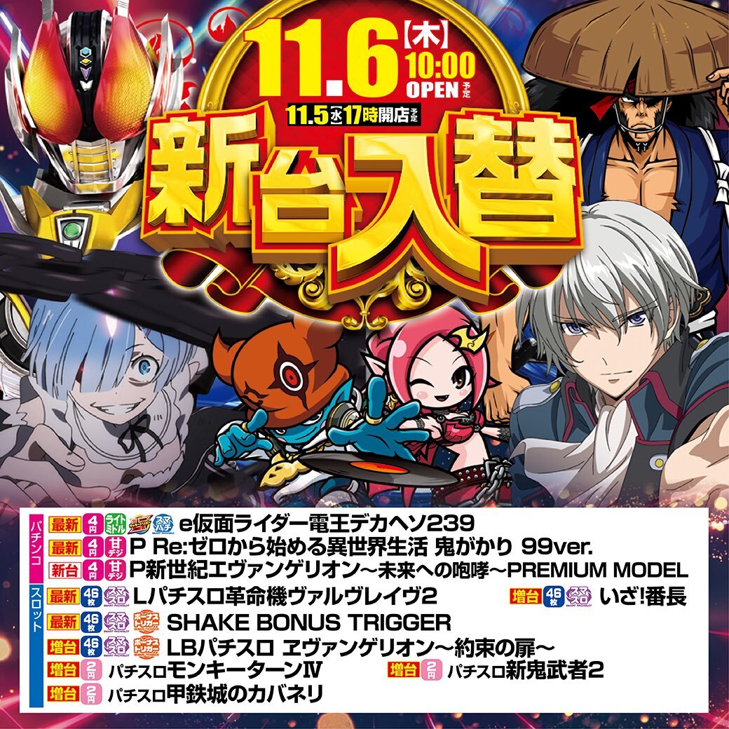 11月6日(木) #新装開店 🌈10:00 OPEN #鬼がかり99 #e仮面ライダー電王デカヘソ239 #シェイクBT #ヴヴヴ2 #Lいざ番長 #LBエヴァ 増台etc... 話題の最新台をごゆっくりお楽しみください✨ 抽選時間は9時30~となります! ご来店お待ちしております ✨ #一番舘 #一番館 #大成 pic.x.com/VNAjcMghCO