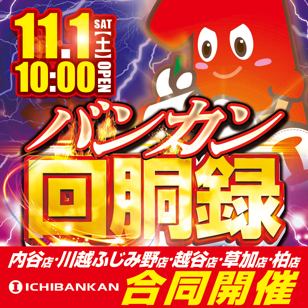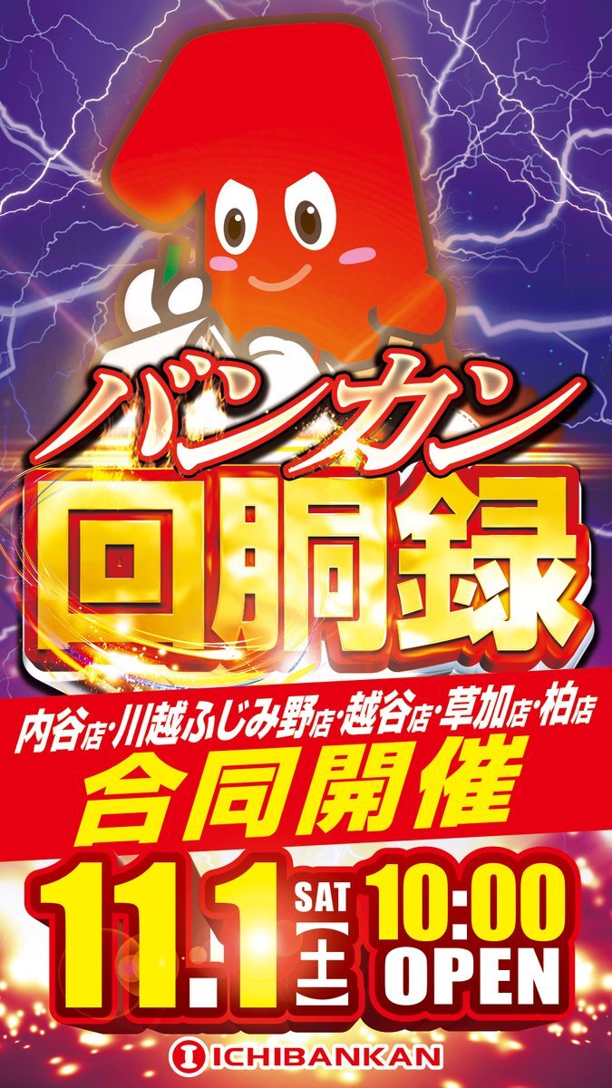 明日は💡💡💡💡💡💡 11月1日(土) ☆10時開店☆ #バンカン回胴録 川越ふじみ野店・内谷店・越谷店・草加店・柏店 ❤️合同開催❤️ #アイドル取材 抽選時間は9:30より開始です!! 朝一よりお並び下さい😀 #埼玉 #川越 #パチンコ #パチスロ #一番舘 #一番館 pic.x.com/MQikrqdFE3