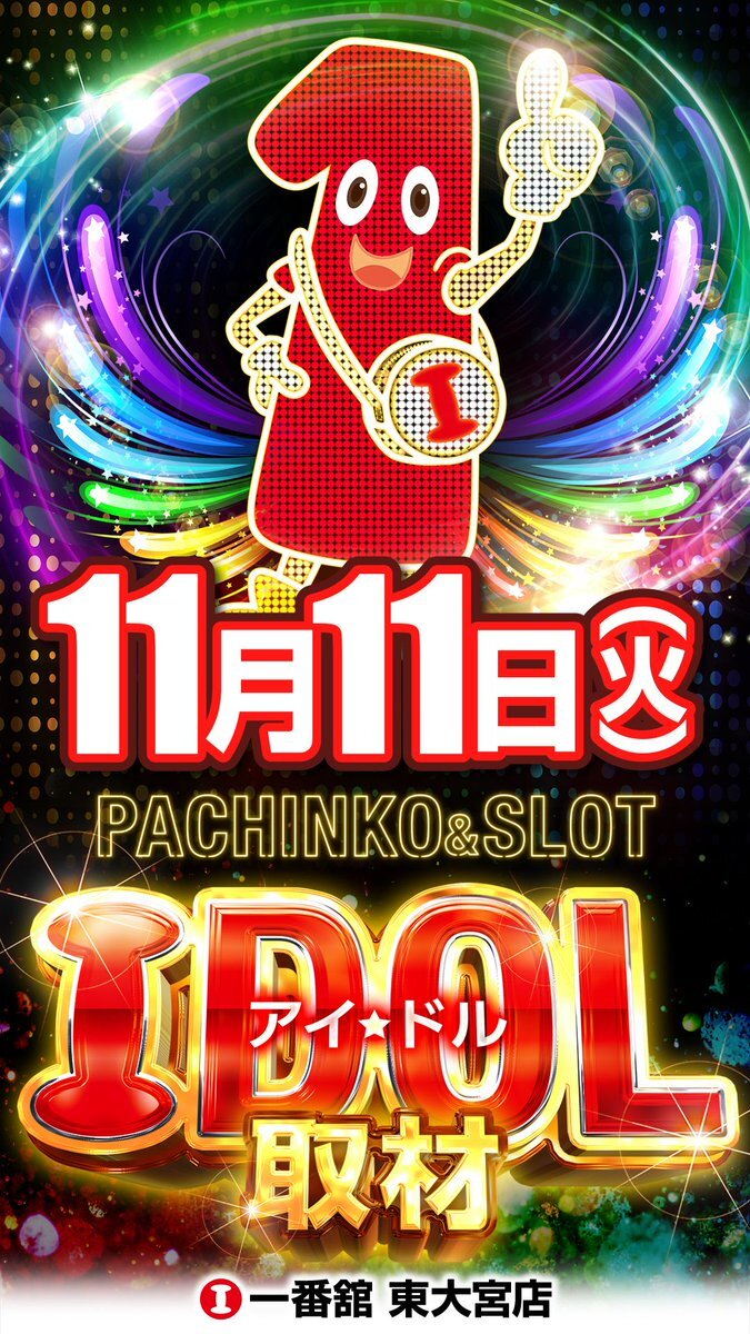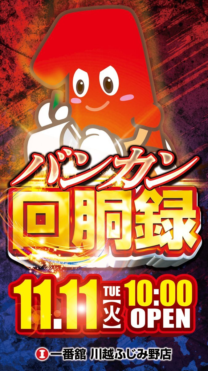 11月11日(火) ☆10時開店☆ #バンカン回胴録 #アイドル取材 抽選時間は9:30より お早めにご来店下さいませ❤️ #埼玉 #川越 #パチンコ #パチスロ #一番舘 #一番館 pic.x.com/6YoJcQPH4V