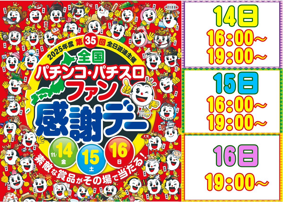 11月 14日㊎15日㊏16日㊐ 第35回全国 パチンコ・パチスロ ✨ファン感謝デー✨ 素敵な賞品が当たる 抽選会も開催! 明日14日(金)は 1回目14時頃 2回目20時頃 配布予定です! ご来店お待ちしております! #一番舘 #一番館 #創業月間 #パチンコ #スロット #ファン感 #ファン感謝デー pic.x.com/PfYwD6QeBW