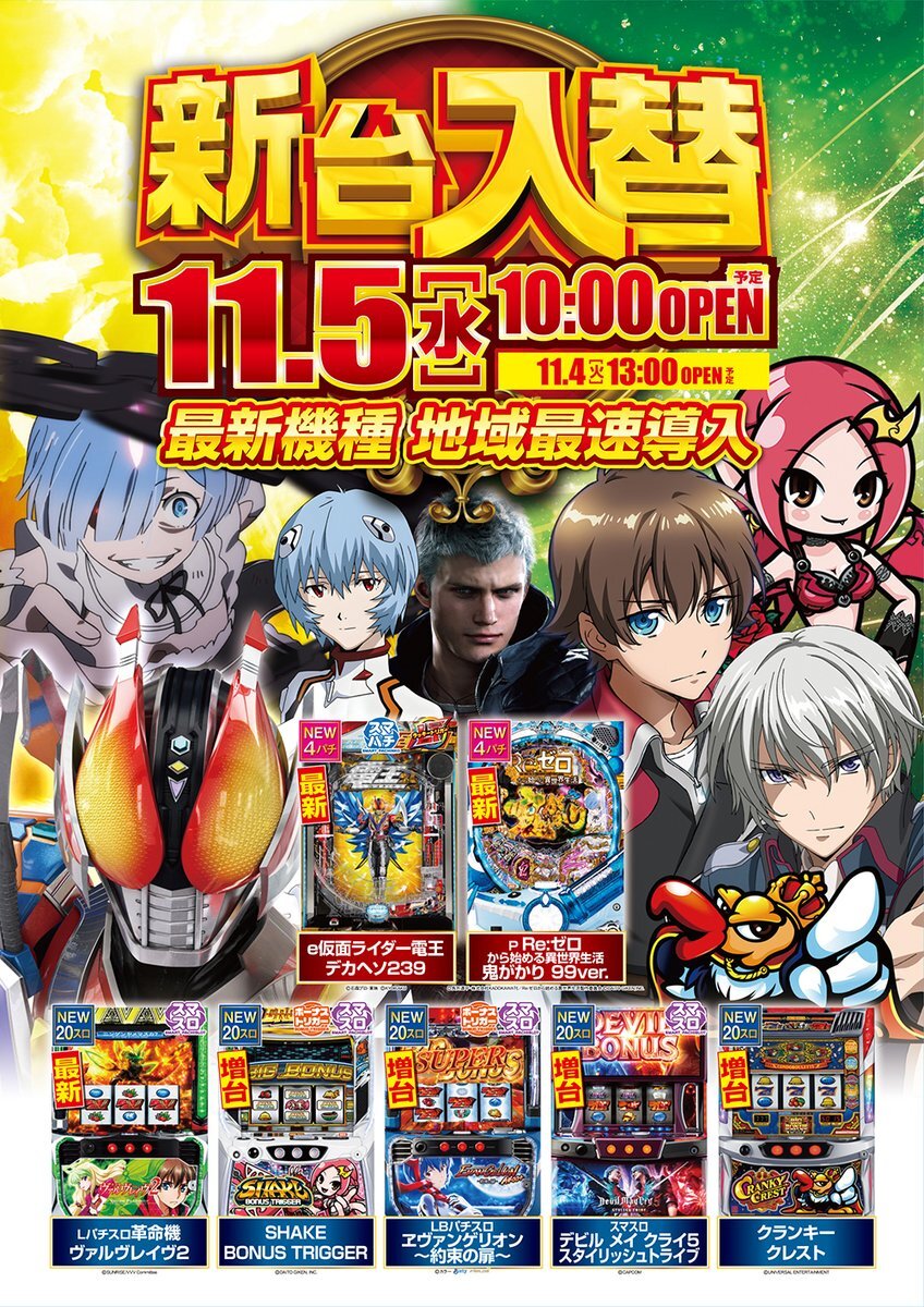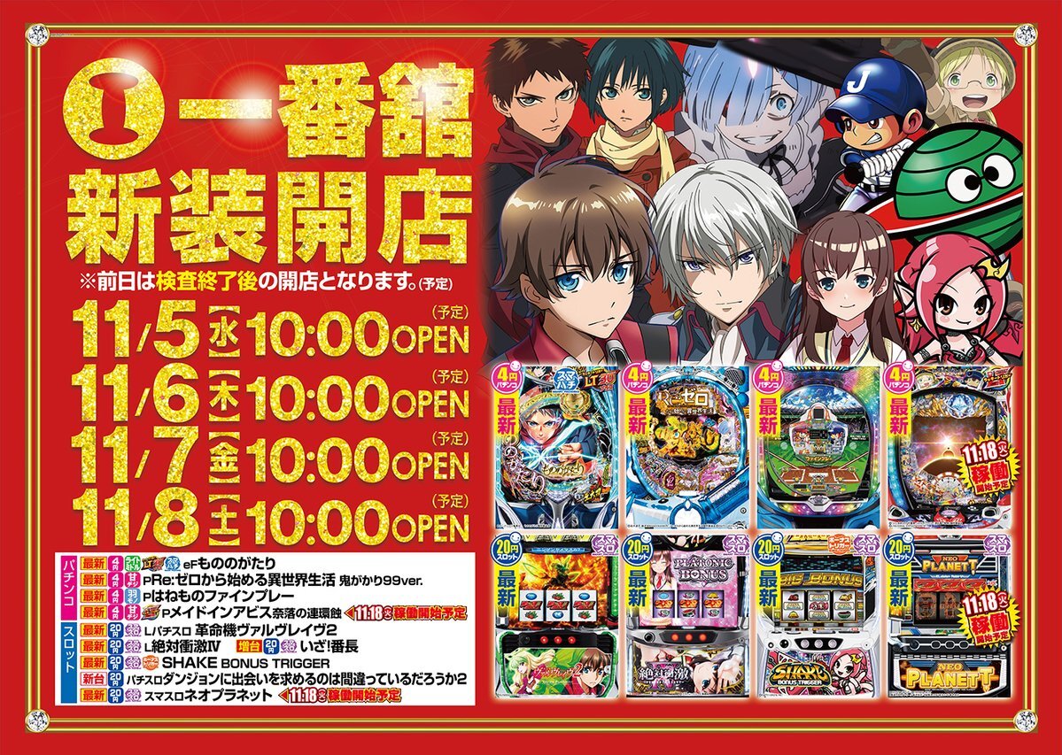 \🎊11月は周年月間🎊/ 🌈1⃣1⃣月6⃣日(木)🌈 》10:00 OPEN!!(予定) 明日は新装開店🤩❤️‍🔥 #L革命機ヴァルヴレイヴ2 #e仮面ライダー電王デカへそ239 #Reゼロから始める異世界生活鬼がかり99ver etc... ぜひご来店お待ちしております🔥 #一番舘 #一番館 #東大宮 #埼玉 #新装開店 #周年月間 pic.x.com/u3eqQSxmuw