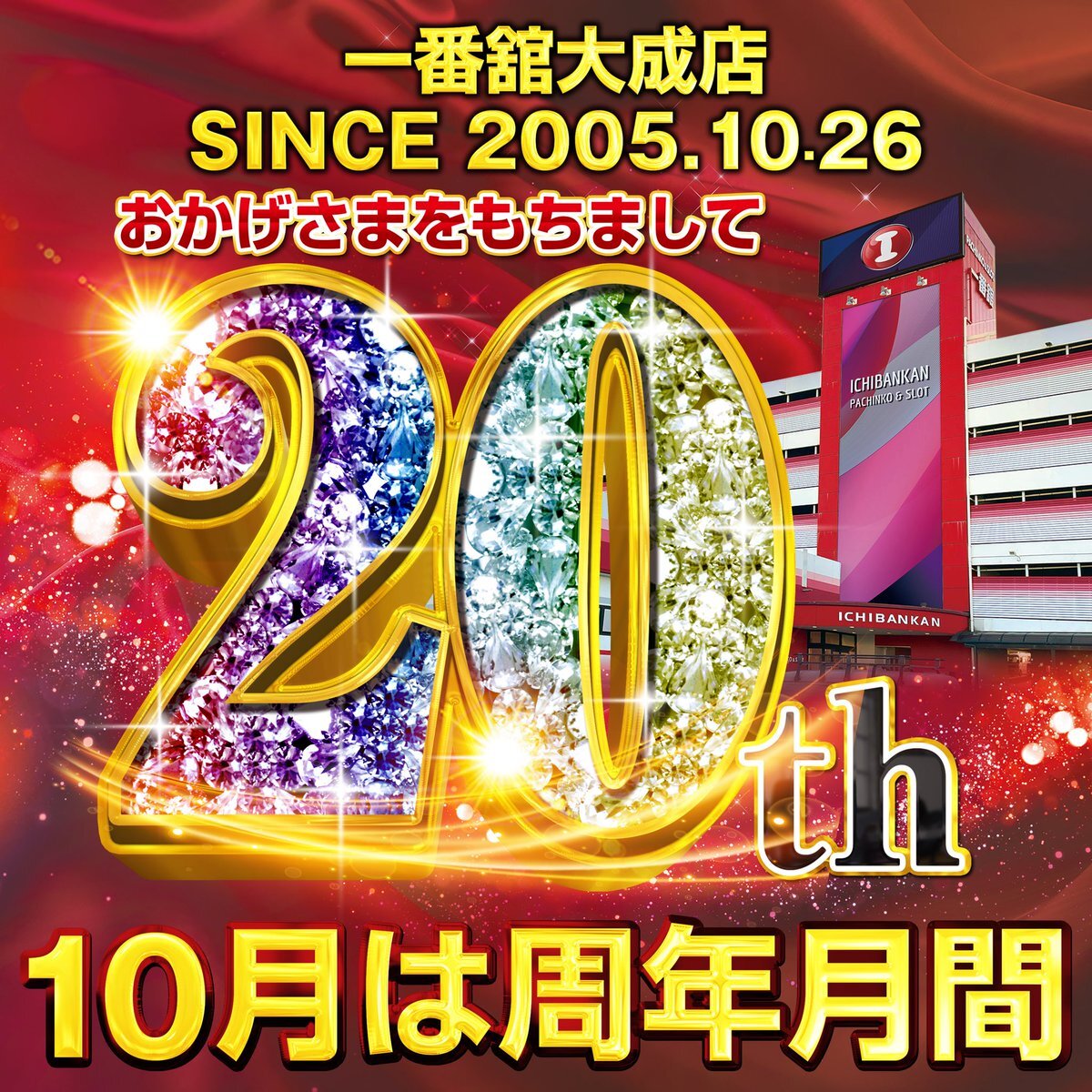 ✭感謝✭ おかげさまで20周年✩.*˚ 🔥10月26日(日)🔥 10:00 OPEN!!(予定) ✅入場抽選9時30分~開始👍✨ ご来店お待ちしております(*ˊ˘ˋ*)。♪:* #一番舘 #一番館 #埼玉 #大成 #パチンコ #スロット pic.x.com/UvZzliafqn