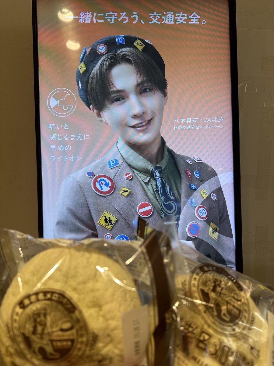 こちら本日最終日です ぎりぎりセーフで見てきました🥹 海老名SA名物のメロンパンと✨ これからも交通安全🚗気をつけます! 素敵な機会をありがとうございました🙏 #JA共済 #一緒に守ろう交通安全 #八木勇征 pic.x.com/hvnZJwUgoJ x.com/jakyosai_safet…