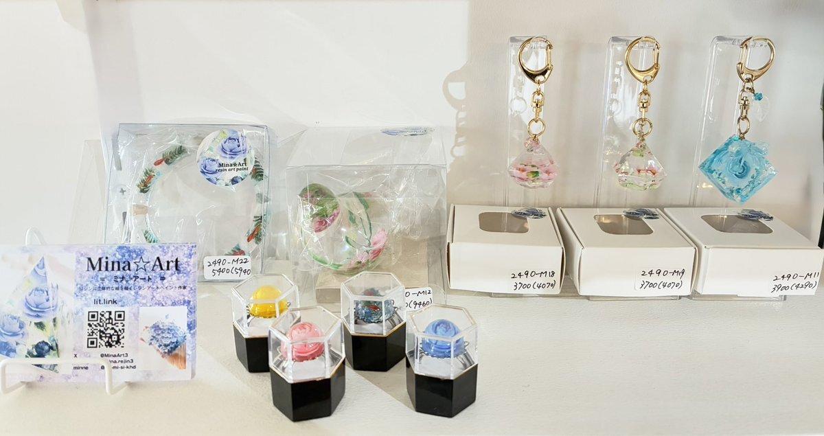 #一色商店常設展 Mina☆Artさん @MinaArt3 作品展示販売スタートしております😊 金魚バングル、鳥型のオブジェのキーホルダーやリング等 通販も対応可能です✨️ お気軽にお問い合わせくださいね!