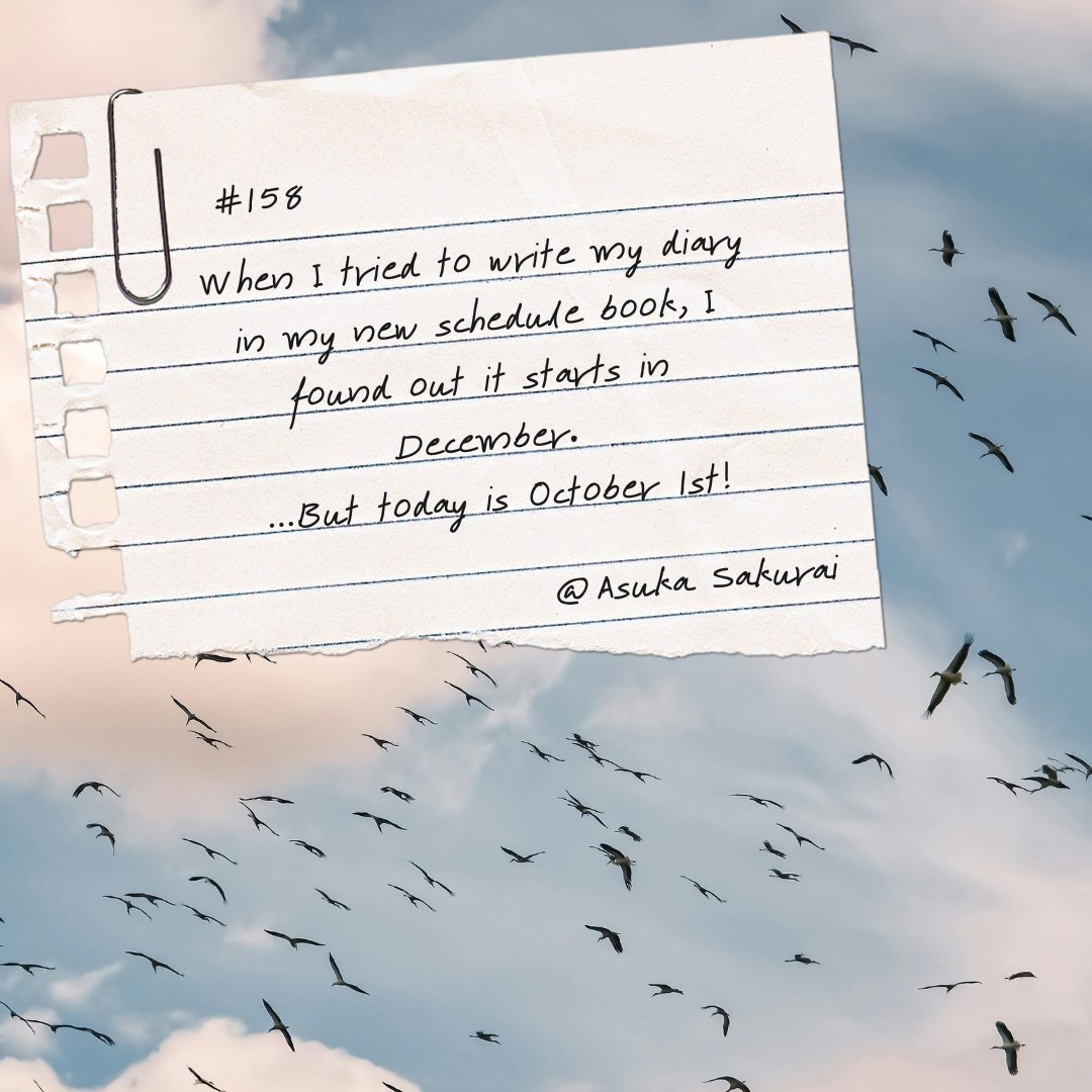 "When I tried to write my diary in my new schedule book, I found out it starts in December. …But today is October 1st!" 手帳の罠。10月から始まっているのはマンスリーだけ。 A one-line diary, paired with a font that speaks. #OneLineDiary #WattpadUser #一言英語日記 #quoteoftheday pic.x.com/juPZgPGbcl