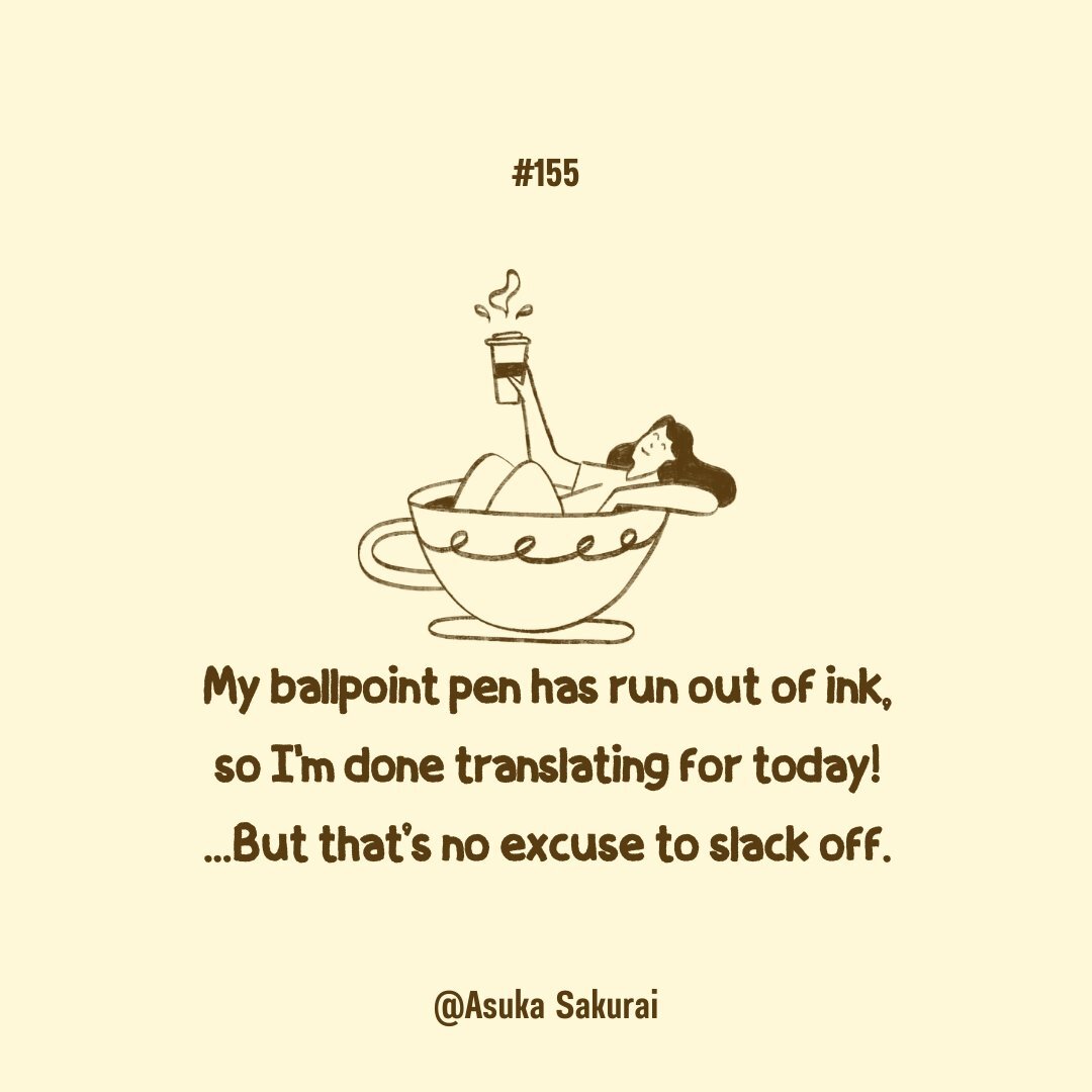 "My ballpoint pen has run out of ink, so I'm done translating for today! ...But that’s no excuse to slack off." ボールペンのインクが切れたから翻訳終わっていいでしょ? A one-line diary, paired with a font that speaks. #OneLineDiary #WattpadUser #一言英語日記 #quoteoftheday pic.x.com/Cpn08BWcsi