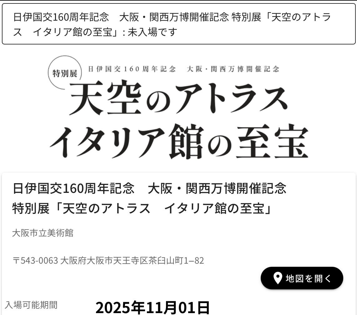 返信先:@ARTPASSofficial特別展「 #天空のアトラス イタリア館の至宝」のチケット完売した原因は…再び… #転売ヤー の暗躍が出てるから… #大阪万博 #大阪関西万博 #万博イタリア館 #大阪市立美術館 ticketjam.jp/tickets/italia…