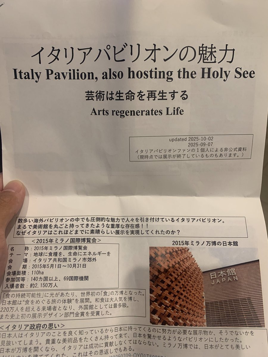 イタリアパビリオンの待ち列周辺でおじさんが配ってた資料受け取ったけど興味深い☺️面白い!!! これ見ながらイタリアパビリオン入りたかった笑 ちなみにイタリアパビリオンが大好きな個人による非公式の資料らしい🤣🤣 #大阪関西万博2025 #大阪万博 #大阪万博 #EXPO2025 #大屋根リング #万博会場 pic.x.com/R01T6v1hZf