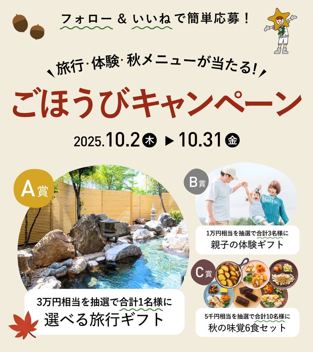 / フォロー&いいねで簡単応募! 秋のごほうびキャンペーン開催🎁 \ 三ツ星ファームで、つむぐ秋時間🍁 この秋だけの “特別なごほうび” をプレゼント🌾✨ 旅行ギフトや秋の味覚セットが当たるチャンス! たくさんのご応募お待ちしております🎉 応募期限:10/31(金)23:59まで #PR
