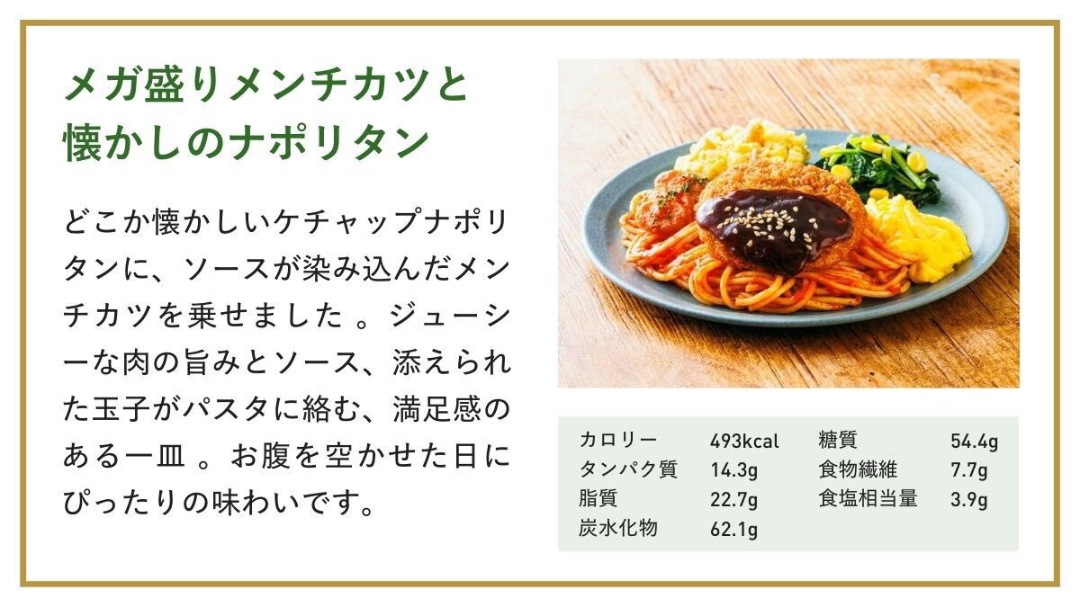 過去案件させていただいてから家族でハマってる #三ツ星ファーム 個人的トップ3は 1位 メガ盛り メンチカツと懐かしのナポリタン 493kcal (炭水化物たっぷり!タンパク質14g) 圧倒的に美味しい。