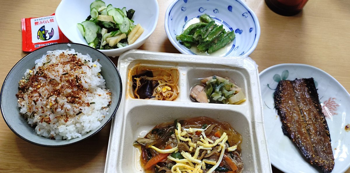 #今日の晩御飯 🍚ふりかけ(鰹みりん)ご飯 🥒胡瓜わかめ揚げの酢の物 🥢四角豆の胡麻和え 🐟秋刀魚の味醂干し #三ツ星ファーム 🐮牛の旨みチャプチェ #晩御飯 #晩飯 #今日の晩飯 #家飯 #自宅飯 #おうちごはん #ばんごはん #晩ご飯 #晩ごはん #ばんめし #晩めし #おかん飯 #お袋飯 #おふくろ飯 pic.x.com/Pmdkw7dyfv