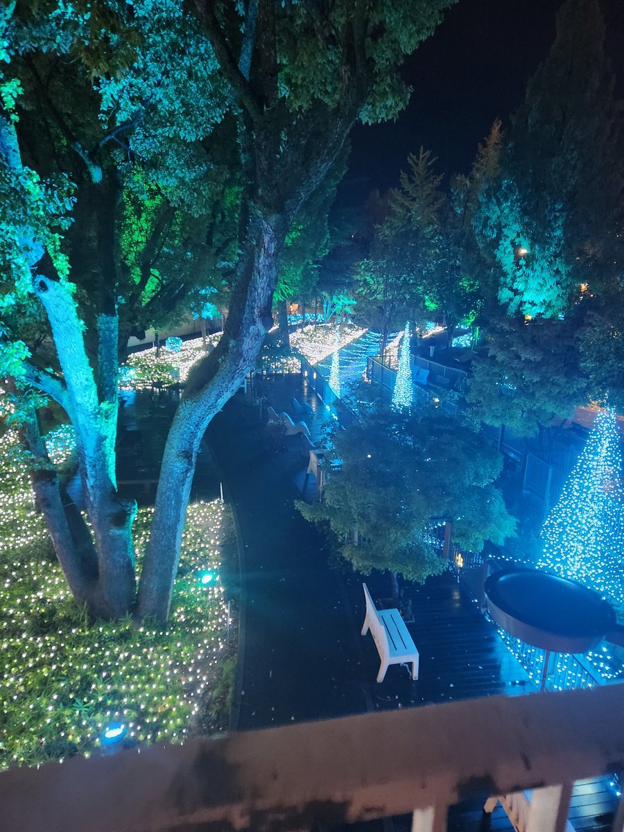 食事と風呂から帰ってきた。 むちゃくちゃライトアップされてるんですが‥。