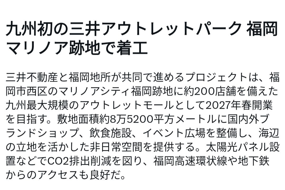 駅からの利便性良くなるかな? 前は西新からバスが出てたが…🚌 #三井アウトレットパーク福岡 #福岡 >> 「(仮称)三井アウトレットパーク 福岡」2027年春開業。マリノアシティ福岡跡地に九州最大約200店舗(トラベル Watch) #Yahooニュース news.yahoo.co.jp/articles/5703e…