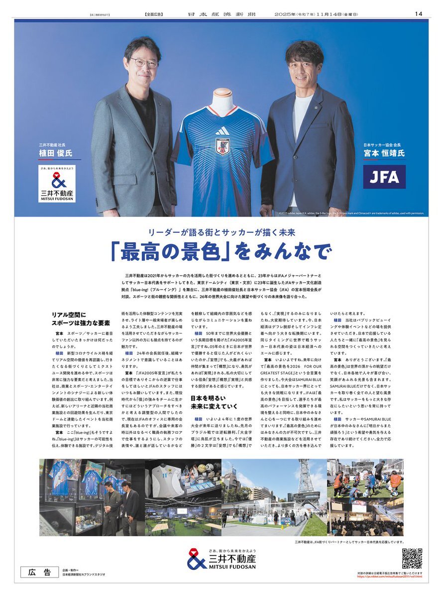 11/14掲載 #三井不動産 の広告です。 JFA街づくりパートナーとしてサッカー日本代表をサポートしてきた同社。 植田俊社長と日本サッカー協会の宮本恒靖会長が、街とサッカーが描く未来について語り合いました。 日経電子版広告特集はこちら ps.nikkei.com/mitsuifudosan2… #日経 #新聞広告 pic.x.com/xxquvH0LH1