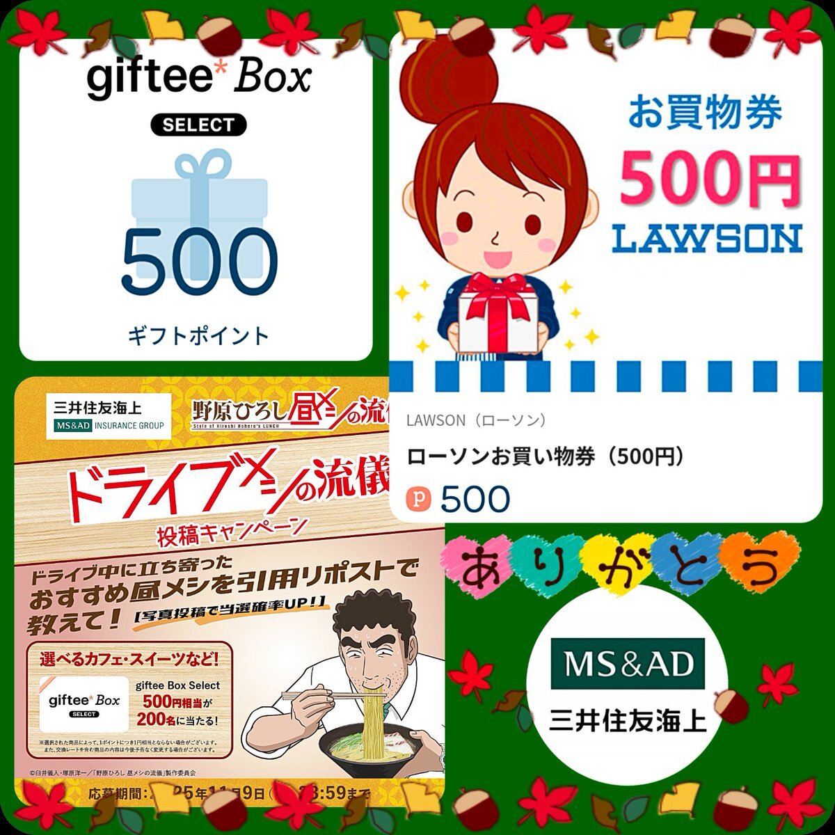 【 当選 】 【公式】三井住友海上 様 ( @msins_pr ) の『ドライブメシの流儀 投稿キャンペーン』に当選させていただき、giftee Box Select 500円分が届きましたのでLAWSON様のお買い物券をチョイスしました🎁 大切に使いたいと思います✨️ ありがとうございました💛 #三井住友海上 #gifteeBox pic.x.com/kw8FtzU57J