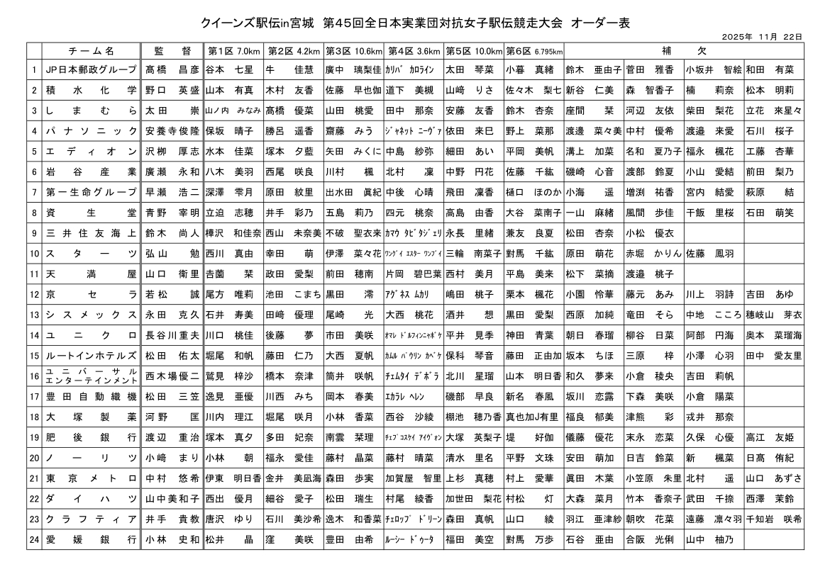 【区間オーダー表】掲載しました‼️ #クイーンズ駅伝 in宮城 ~第45回全日本実業団対抗女子駅伝競走大会~ 2025年11月23日(日) 12時15分スタート 松島町文化観光交流館前~ 弘進ゴムアスリートパーク仙台(仙台市陸上競技場) 宮城コース 42.195km jita-trackfield.jp/schedule/in-e/