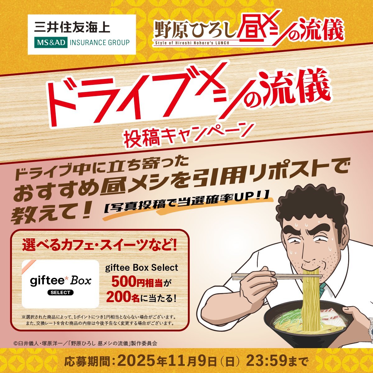 / 「ドライブメシの流儀」投稿キャンペーン \ ドライブ中に立ち寄ったおすすめ昼メシ🍚を引用リポストで教えてください✨ 抽選でgiftee Box Select 500円相当をプレゼント🎁 写真を投稿で当選確率がUP👏 💡応募方法💡 ①@msins_prをフォロー ②この投稿を引用リポスト