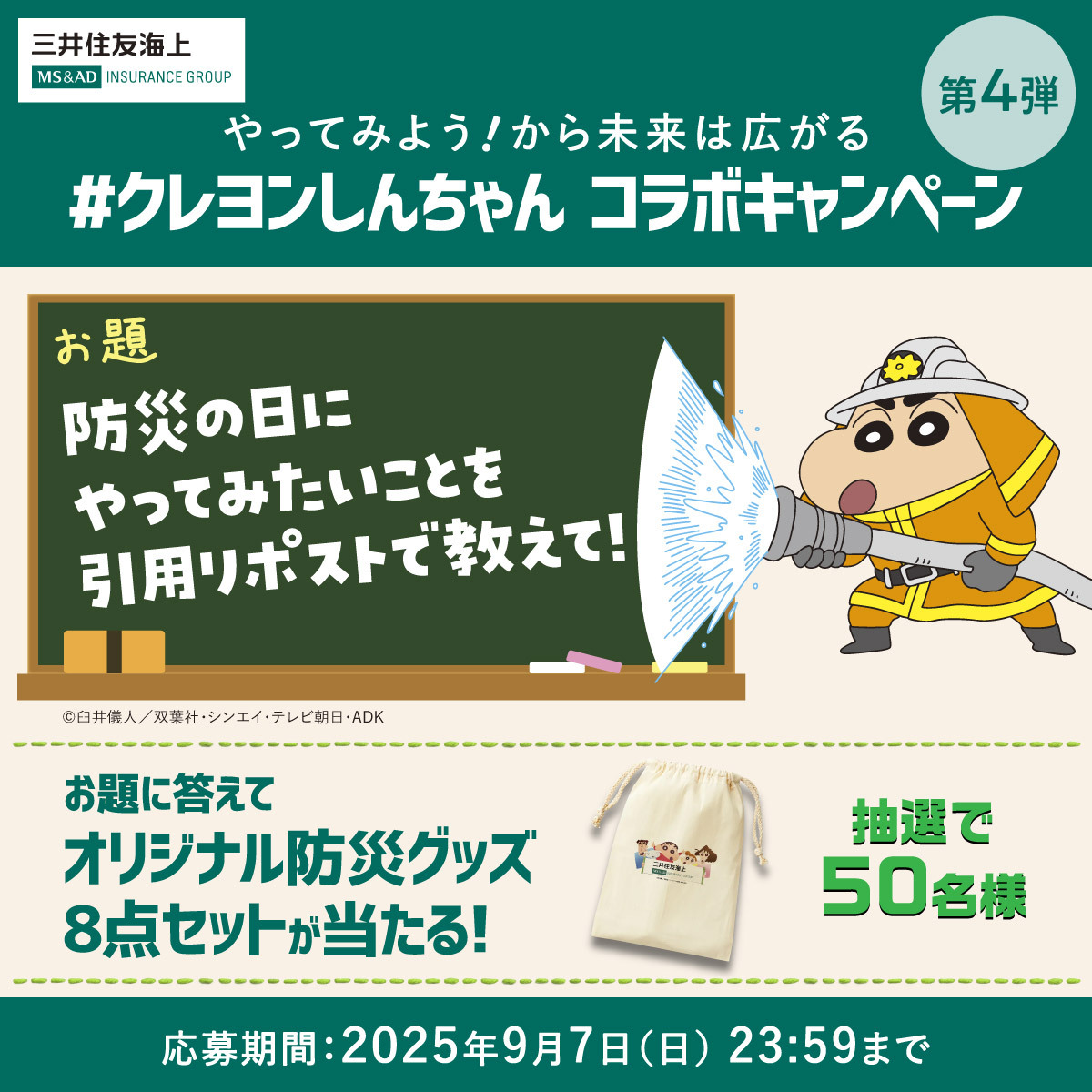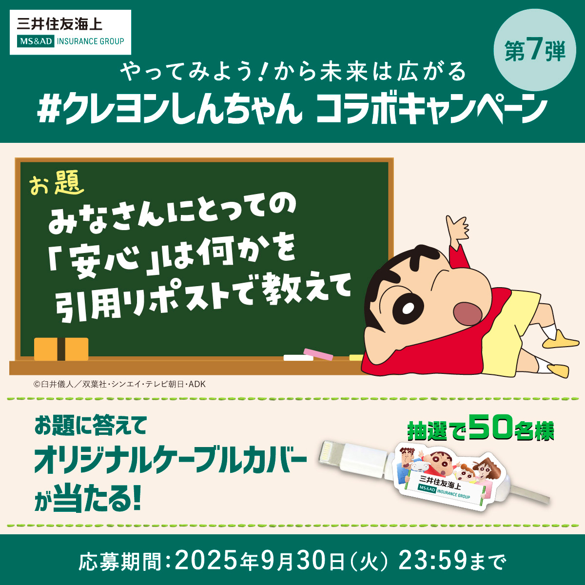 やってみよう!から未来は広がる \#クレヨンしんちゃん コラボキャンペーン/ 第7⃣弾は「みなさんにとっての”安心”は何かを教えて」です✨ 三井住友海上は、みなさんの「やってみよう!」を「安心」で後押しします。 ✅応募方法 ①@msins_prをフォロー ②この投稿を引用リポスト #三井住友海上新CM