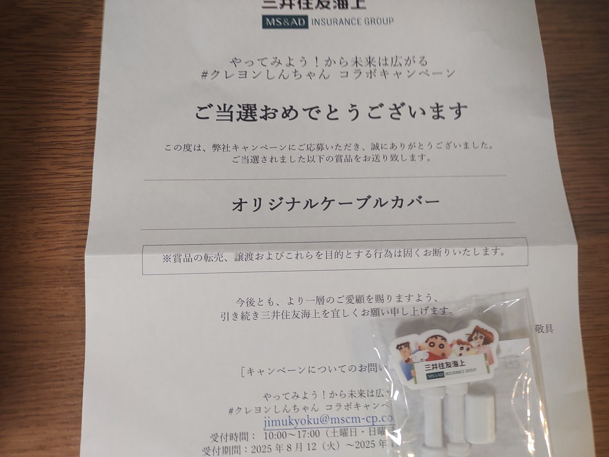 【公式】三井住友海上様にクレヨンしんちゃんのオリジナルケーブルカバーを当選いただきました。 当選いただきありがとうございます。 年末大掃除中ですので、いい場所を見つけたら取り付けたいと思います。 #当選報告 #三井住友海上 #クレヨンしんちゃん #ケーブルカバー pic.x.com/ZIpyQOiwDv