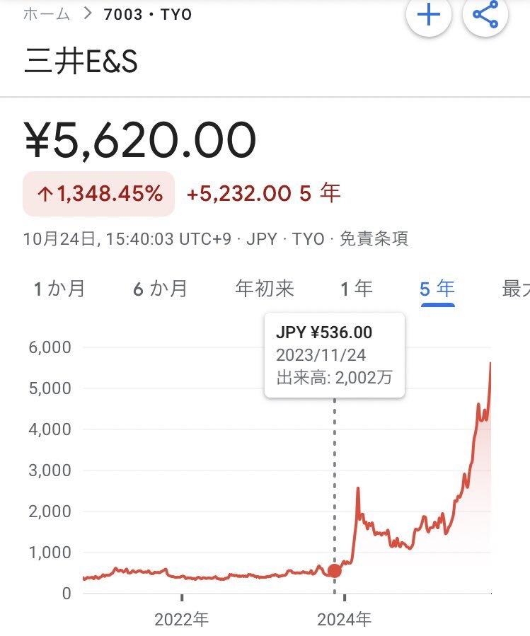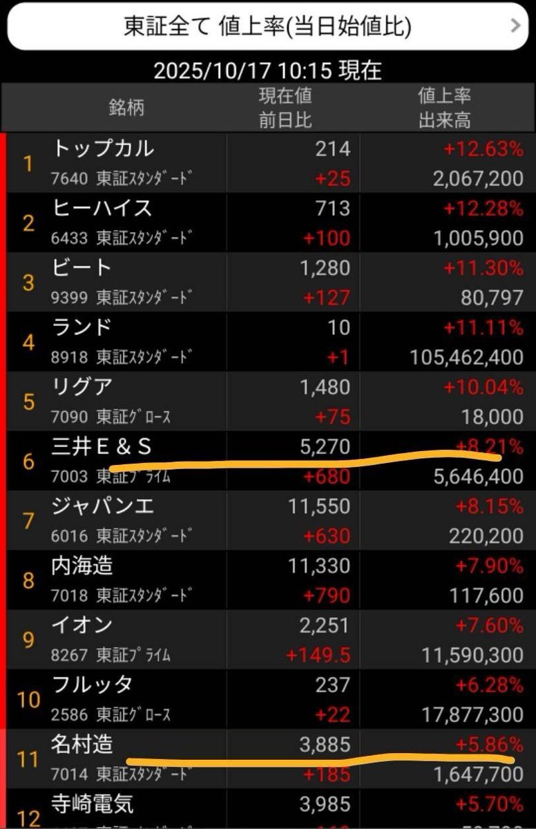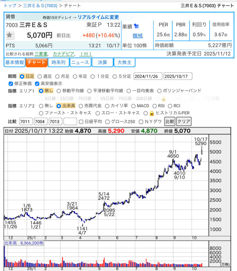 (7003)#三井ES 本日のプライム市場での値上がり1位🥇 業績絶好調が続く中で更に上振れニュースで株価は大きく上へ! 造船から始まり150年の歴史! 造船から撤退して大きく息を吹き返しての今! 1年半前にYouTubeで取り上げてから株価3倍以上ですがもちろん保有出来ず…。 pic.x.com/krID4msSAq