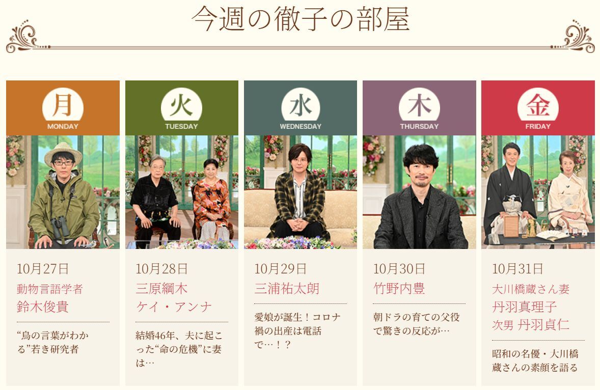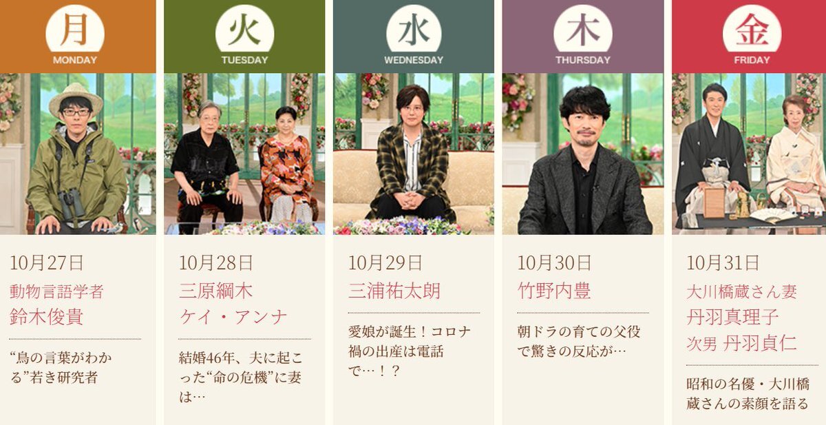 📺#徹子の部屋 今週のゲスト ★ABEMA/TVerで一週間無料配信 10/27(月)<動物言語学者>#鈴木俊貴 さん 10/28(火)#三原綱木 さん #ケイ・アンナ さんご夫妻 10/29(水)#三浦祐太朗 さん 10/30(木)#竹野内豊 さん 10/31(金)大川橋蔵さんの<妻>丹羽真理子さん <次男>丹羽貞仁さん pic.x.com/lqbmnb0rMV x.com/volante_libero…