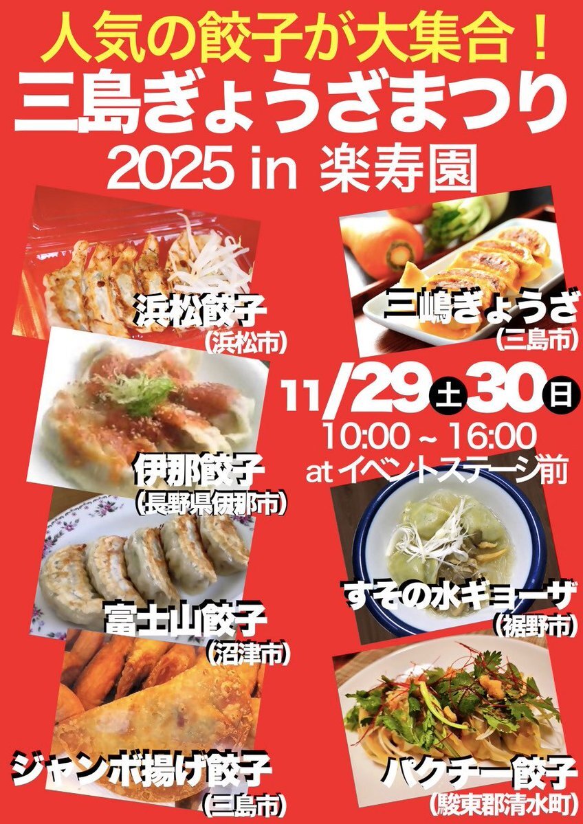🥟🥟11/29(土)&11/30(日) #餃子フェス 『 #三島ぎょうざまつり 』2DAYS🥟🥟 . ✨ #楽寿園菊まつり ファイナルイベント‼️@ #楽寿園 ✨ . 各地で愛される餃子を味わえる、毎年恒例餃子まつり❢ . 11/29(土)は『 #おとくえん 』、11/30(日)は『 #三ツ沢グッチ 』とコラボイベントとなります🎤🎶 pic.x.com/HwjuNHUu48