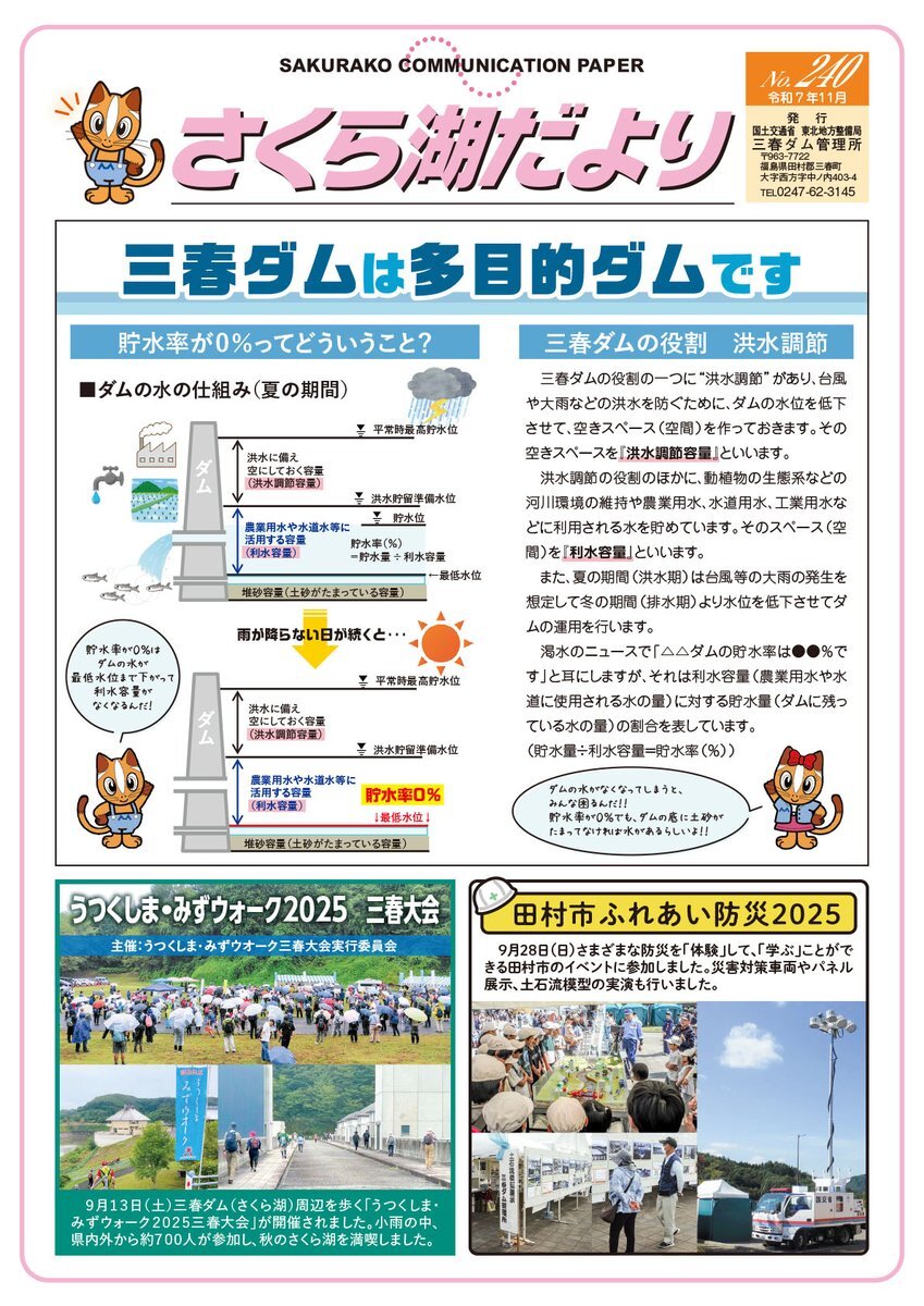 【お知らせ】 さくら湖だより 240号 を発行しました! バックナンバーは三春ダムのホームページからもご覧いただけます。 thr.mlit.go.jp/miharu/downloa… #三春ダム #さくら湖 #三春町 #福島県 #水しごと #地域に開かれたダム pic.x.com/a9oWTMFG5q