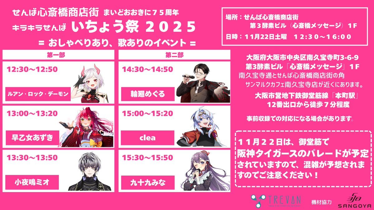 📢せんば心斎橋筋商店街「イチョウ祭り」 明日(11/22)は、Vtuberによるトーク&ライブショーが予定されています! #三木楽器 も協力しております。 観覧無料となっておりますので、 ぜひお気軽にお立ち寄りください✨ また、すぐ近くの開成館では、 X'masピアノセールも開催中です🎹🎄 pic.x.com/VgUi3ENrQl