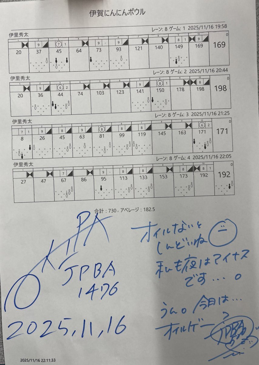 11/11 R1市川鬼高店 三浦美里プロ(@520misato )チャレンジ 夜の部に参加しました🎳 スコアは美里プロが再接近したゲームだけ爆打ちするという、非常に分かりやすいスコアシートになりました😅 てかハンデ要るのか⁉️って話ですけど、ハンデ込みで7位でした🙇♂️