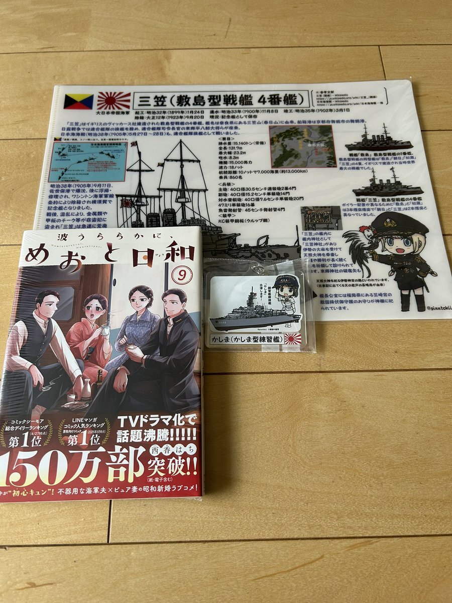 読者の方より差し入れをいただきました。 西賀はち先生の新刊と銀時さんの三笠とかしまのグッズ♪ ありがとうございます。愛用させていただきます! #西賀はち #波うららかにめおと日和 #練習艦かしま #三笠 pic.x.com/LYbRIHbxxg