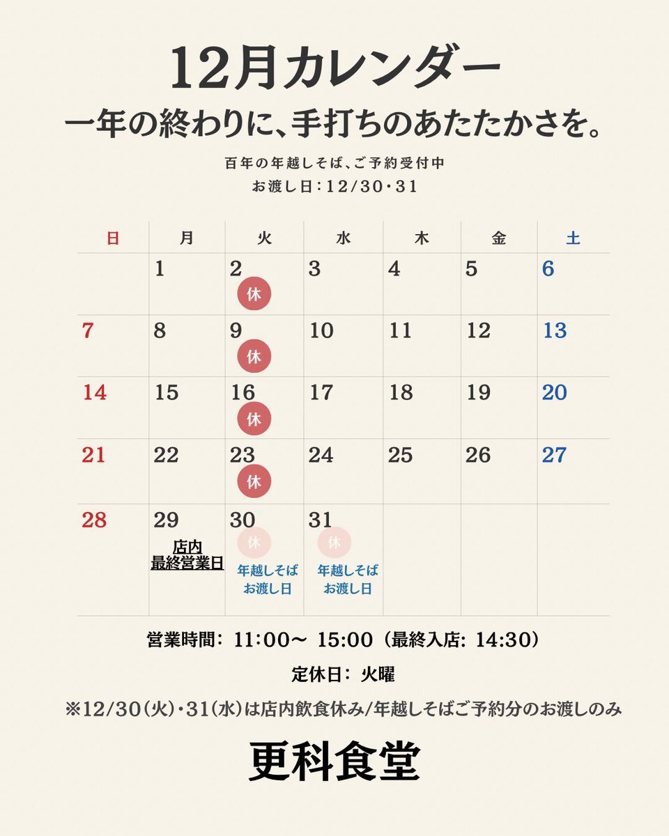 【12月カレンダー】🗓️ 年の瀬こそ来られる方はぜひ店内で “100年の一杯”を😊 ✅火曜定休 ✅12/29店内最終営業日 ✅30・31は年越しそばのお渡しのみ 年越しそば只今ご予約受付中♫ 今年のしめくくりにぜひ🍜 👉 ご予約フォームは画像QRからどうぞ♫ #更科食堂 #三笠 #100年食堂 #年越しそば pic.x.com/cgiBWDT3Ud