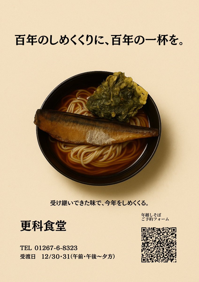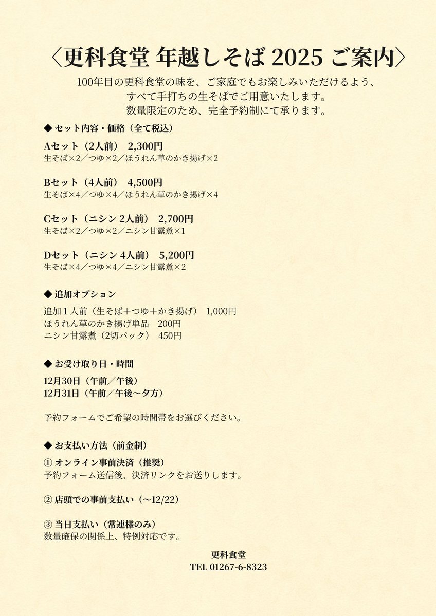 百年のしめくくりに、百年の一杯を。 ✅ 受け渡し12/30・31(午前/午後~夕方) ✅ セット2人前~4人前+オプション ✅ 数量限定・完全予約制 #更科食堂 #年越しそば2025 #三笠 #手打ちそば 更科食堂「年越しそば2025」 ご予約フォームはこちら👇 forms.cloud.microsoft/Pages/Response… pic.x.com/WLrZFy0vAA